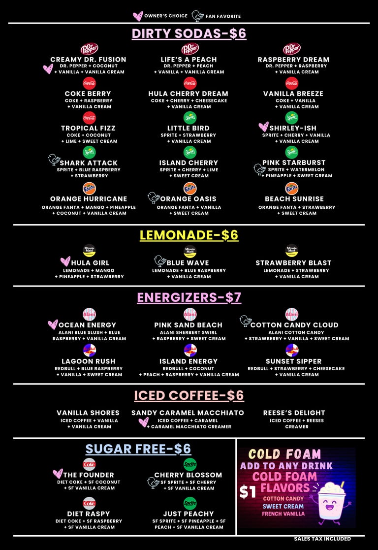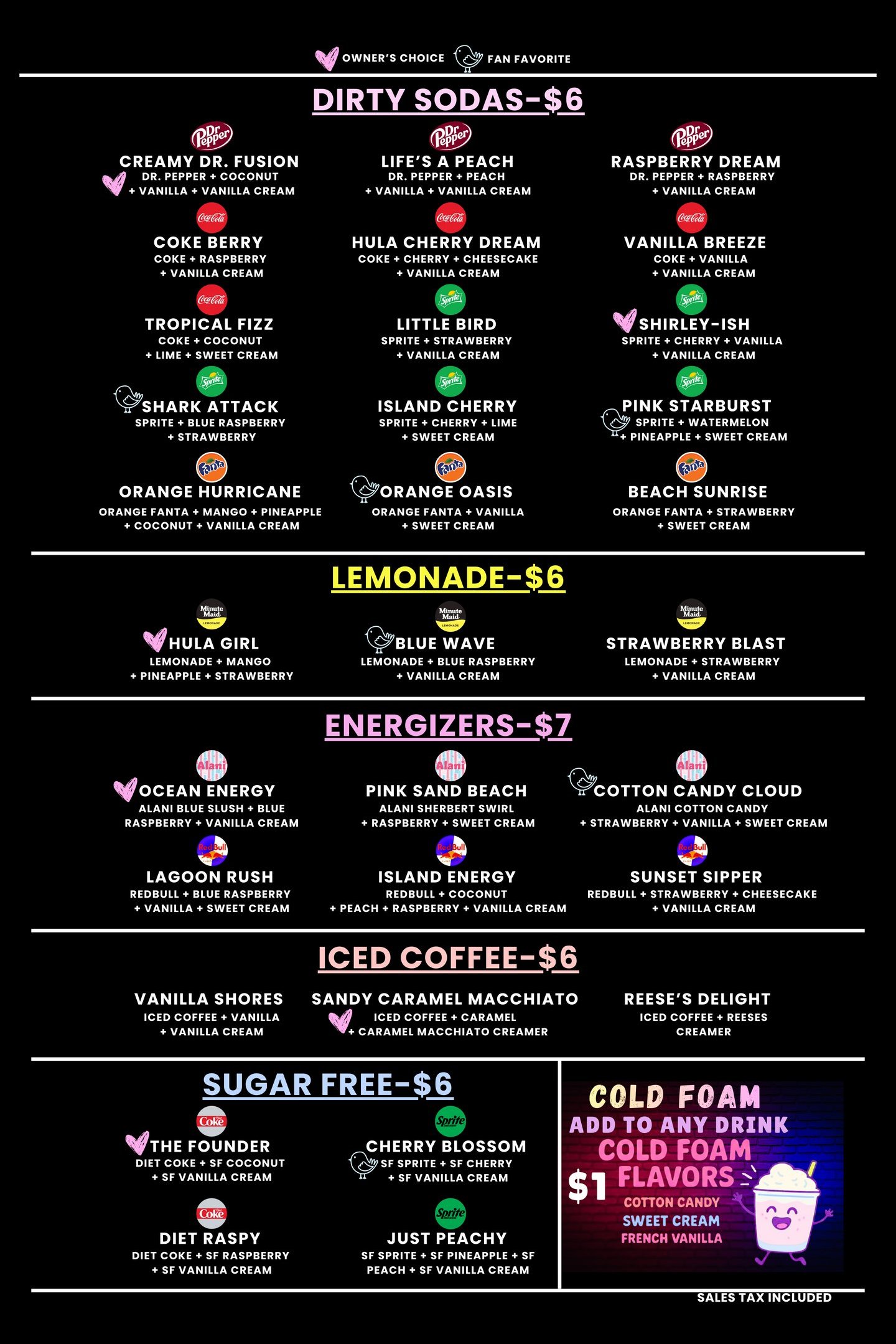 Dirty soda is a soft drink made better. We mix your favorite soda with flavored syrups, and a splash of cream to create a smooth, fizzy, flavor-packed treat. Fully customizable. Ridiculously good. Never boring, and seriously addictive.